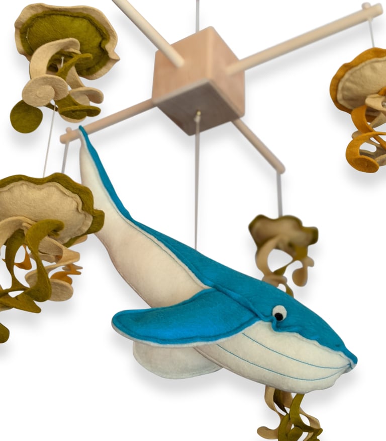 This mobile includes 6 jellyfishes and a whale. They are suspended from a handmade alder wood hanger.